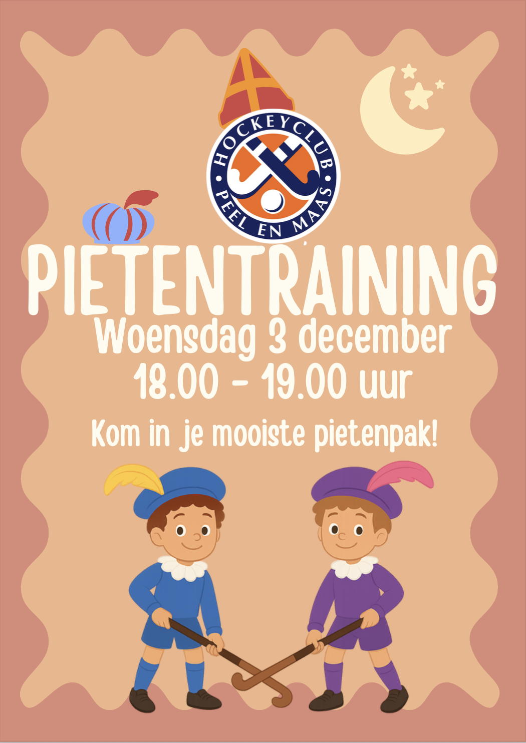 Tijdens de Pietentraining van Hockeyclub Peel en Maas wordt het een uur vol plezier, spelletjes en hockeypret in echte Sinterklaassfeer! 🏑✨